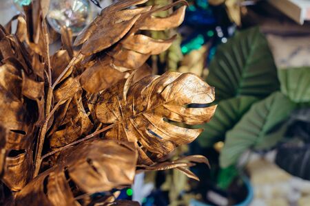 Close up Artificial tropical Monstera leaves decor on the colourfull background. Modern creative interior details. Selective focus. Copy space