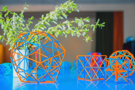 Coloured three-dimensional model of geometric solids de-focused on the blue table against blurred background of willow branches and back of the classroom. Selective focus.