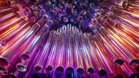 Abstract futuristic technology background with glowing colorful glass tubes and metallic cylinders creating dynamic perspective in purple pink orange blue light.