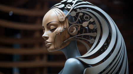 a woman with a wire design tattoo is depicted in this 3d rendering. the tattoo features robotic motifs, serene faces, and intricate details reminiscent of computer-aided manufacturing. the overall color scheme is dark silver and bronze, creating a visually striking contrast. the shallow depth of field adds depth and focus to the wood sculptor's algorithmic artistry. ai generated