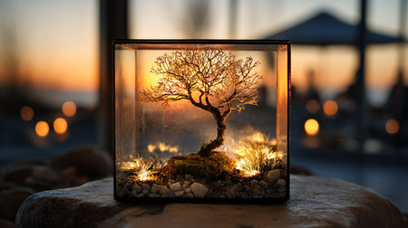 A beautifully arranged dining table featuring elegant glassware and colorful decorative items under ambient lights, perfect for a festive gathering or special event.