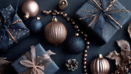 A serene festive setup blending dark blue and rose-gold hues in perfect visual balance.