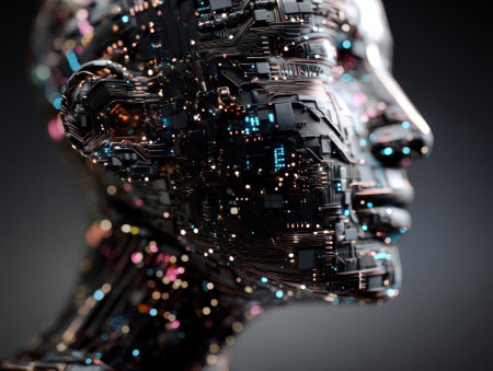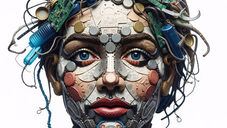 Futuristic face sculpture made of circuit boards and glowing lights in various colors, showing intricate technological design, creativity, and innovation with a modern aesthetic
