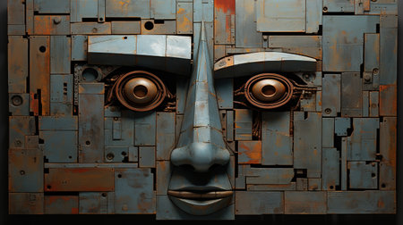 Generative AI, Abstract robotic face on rusty vintage metal background, geometric shapes