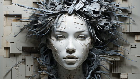 Artistic representation of artificial intelligence using electronic cables and network wiring forming a human face