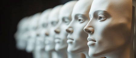 AI Generated. Collection of Wooden Mannequin Heads Displayed in a Row Outdoors