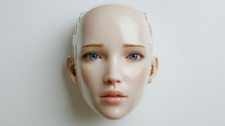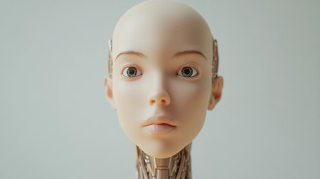 Close up of female robot head. Futuristic artificial intelligence concept.