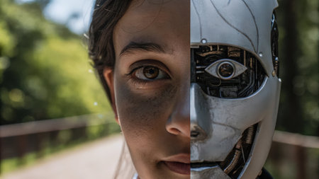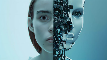 A split image showing one half of a human face and the other half designed like a robotic mask merging human emotion with artificial intelligence emphasizing the coexistence of.