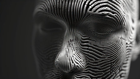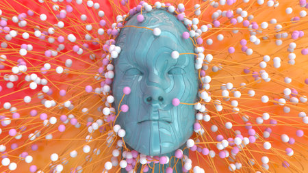 Illustration of a neural network in the shape of a human face.An abstract digital human face. The concept of artificial intelligence big data or cybersecurity.Abstract illustration of metallic human faces on background.