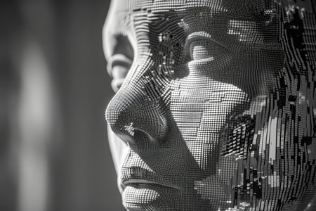 A face displays a captivating division, where one side reveals natural human contours and the other showcases intricate robotic mesh, highlighting duality.