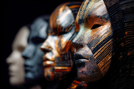 Glowing, avant-garde masks resembling human faces emit vibrant hues in a dim environment, blending art and technology to evoke a sense of mystery and innovation