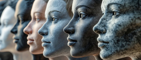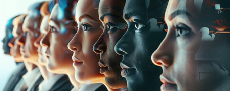 Multiple photorealistic faces showcase diverse nationalities, celebrating the unity of the human family tree in a striking artistic composition.