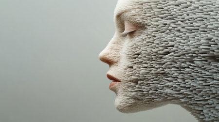 Surrealistic human face created by arrayed pixel particles face forming in glistering futuristic. Inspiration of split body composite digital graphic art design innovation. Finest generative AI.