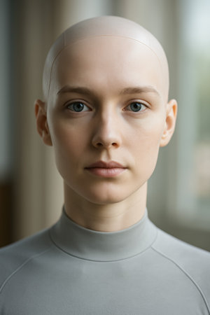 A close-up portrait of a bald individual wearing a simplistic gray outfit indoors