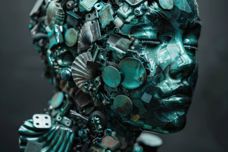 Abstract womans head sculpture made out of buttons and metal objects on black background, creative art concept