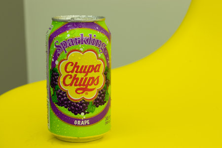 Moscow, Russia - 5 December 2020: Chupa Chups drink in can, Chupa Chups product logo, Illustrative Editorial.