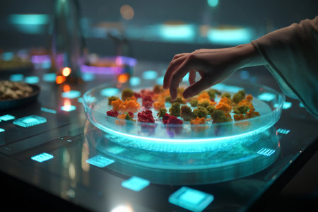 A hand delicately selects colorful gourmet bites from a glowing platter, enhancing a modern dining experience. The atmosphere is inviting, highlighting intricate details of the exquisite dishes.