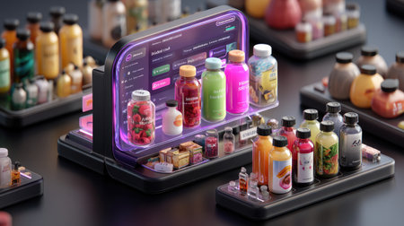 A vibrant product display showcases a modern arrangement of colorful bottles and containers, highlighting the intersection of technology and design in advertising.