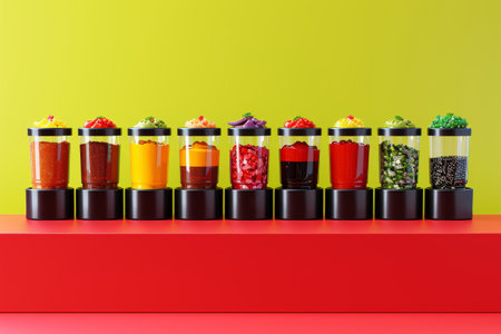 A row of colorful jars filled with various spices and condiments. The jars are arranged in a row on a red surface, creating a visually appealing display. The colors of the jars