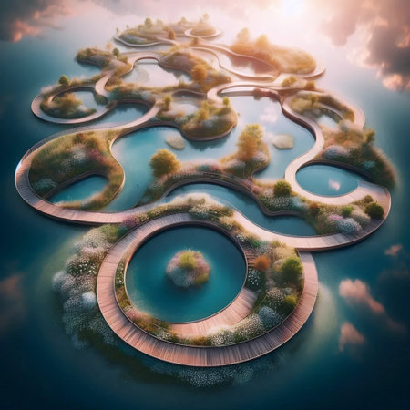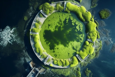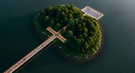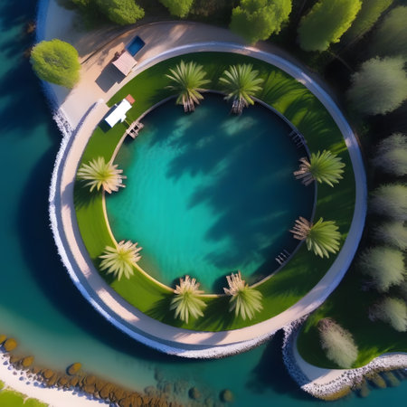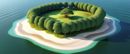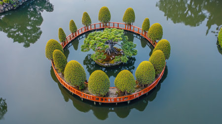 A tranquil aerial view of a circular garden island surrounded by still water, featuring lush greenery and a wooden fence, creating a serene atmosphere.