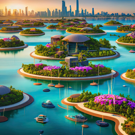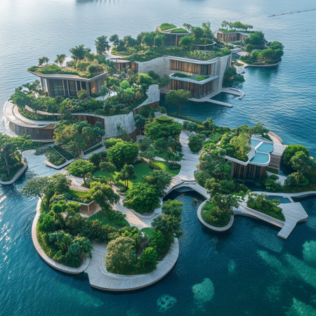 A luxurious, eco-friendly floating island resort surrounded by water, featuring modern architecture and lush greenery, symbolizing sustainable living and futuristic design.