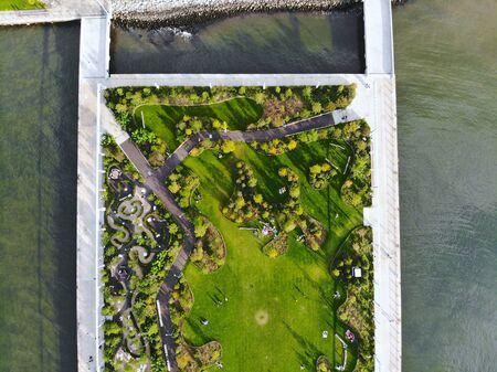 Aerial view of a meticulously designed urban park with walking paths, trees, and water features
