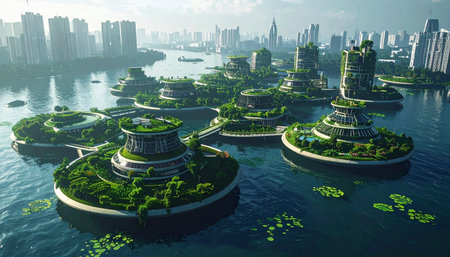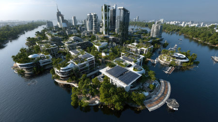 A stunning aerial view of a futuristic urban landscape featuring modern architecture, surrounded by water channels and lush greenery, showcasing sustainability.