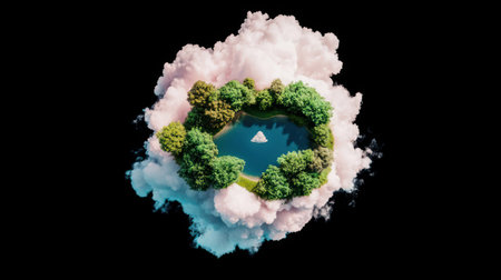 A captivating image of a small island with lush greenery and a tranquil lake, enveloped by colorful clouds against a black backdrop.