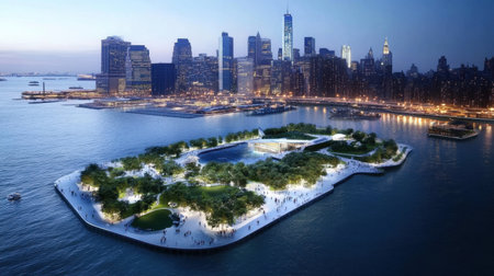 A vibrant urban park illuminated at dusk surrounded by the Manhattan skyline and reflecting waters with people enjoying the space.