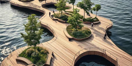 A group of people walking across a wooden walkway. Modern wooden waterfront concept, organic shapes, biodegradable materials, trees and benches.