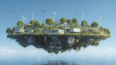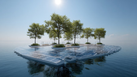 A futuristic floating island is covered with solar panels and surrounded by lush trees, reflecting the sun's rays on the calm water. This innovative design promotes sustainability.