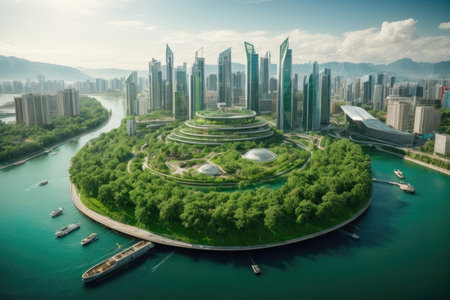 Aerial view of a futuristic city with towering skyscrapers, a winding river, and a unique green island oasis featuring modern architecture and lush vegetation.