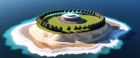 Modern circular building on a lush island surrounded by blue ocean waves.