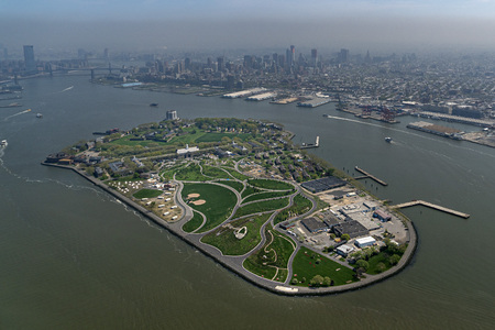 Aerial view of downtown Brooklyn with Park Pier 5 and Hudson River. New York City. USA. Brooklyn is the most populous of New Yorks five boroughs.