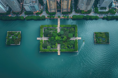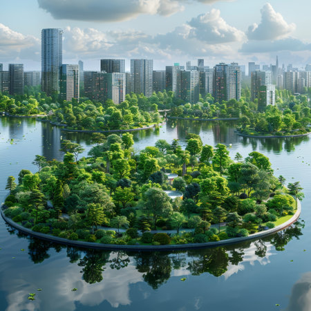 Stunning aerial view of a lush green island amid a tranquil lake, surrounded by modern buildings, highlighting the contrast between nature and urban life.