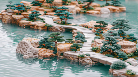 Miniature Japanese Garden With a Bridge Over Calm Blue Water, Serene and Tranquil Scene.