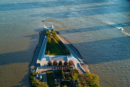 An aerial perspective captures a vibrant green island, densely populated with trees, nestled within the calm waters of a wide river. The scene is bathed in soft, natural light, highlighting the tranquility of the landscape.