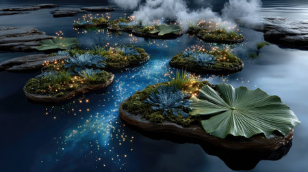 Discover a breathtaking scene of floating islands adorned with verdant greenery and sparkling lights, creating a tranquil and enchanting atmosphere at night.