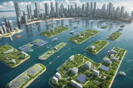 The aerial view captures a futuristic coastal city with advanced green technology, including tidal energy converters and a floating solar farm. The city is surrounded by a body of water, showing the harmony between urban development and sustainable energy solutions.
