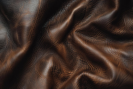 A creative digital illustration depicting Commercial digital art featuring supple dark leather texture with natural creases, tight close-up shot, warm ambient glow revealing details, mysterious indulgent mood, espresso brown and shadow black. This AI-generated artwork features unique visual elements suitable for various commercial and editorial applications. AI-generated illustration.