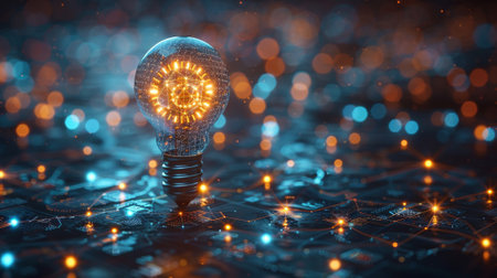 A light bulb with intricate glowing circuitry inside, set against a dark background, symbolizing innovation and bright ideas. The image highlights creativity and the concept of technological advancements.