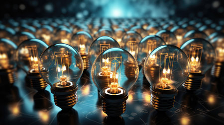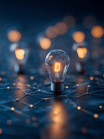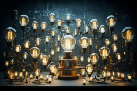 Bright light bulbs connected in a web, lighting up a dark space and symbolizing the synergy of creativity and business growth.