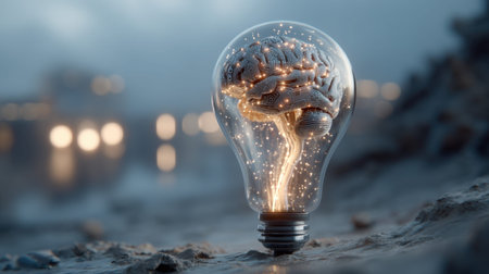 A captivating image showcasing a light bulb containing a brain, illuminating with vibrant neural connections. This stunning visual symbolizes creativity and intelligence, inviting viewers to explore concepts of innovation and thought in a mesmerizing, dreamlike setting.