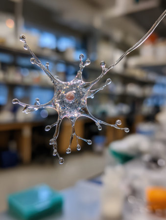A transparent neuron with intricate extensions floats in a clean lab environment, showing cutting-edge research in cellular biology and neuroscience.