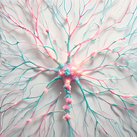 This digital artwork presents a detailed close-up view of neurons, showcasing their intricate structure and connections, highlighting the complexity of the nervous system.