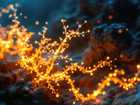A visually striking abstract representation of neural pathways or a digital network with luminous nodes and lines, illustrating concepts of communication, science, and innovation.