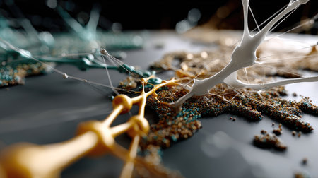 An abstract 3D rendering of a complex, branching network resembling a root system or neural pathways. Golden lines with glowing nodes spread across a dark, textured surface, symbolizing concepts like artificial intelligence, data networks, connectivity, and biological systems.