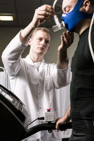 Shot of a young sportsman on a treadmill and a doctor adjusting oxygen mask on his face