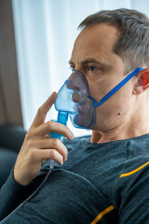 Close up view of unhealthy man wearing nebulizer mask in home. Health, medical equipment and people concept. High quality photo