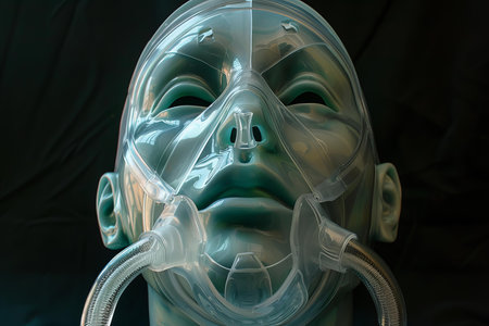 A prone individual with a secured oxygen delivery device, eyes shut calmly, amidst clinical surroundings, conveying focused medical care and respiratory assistance.